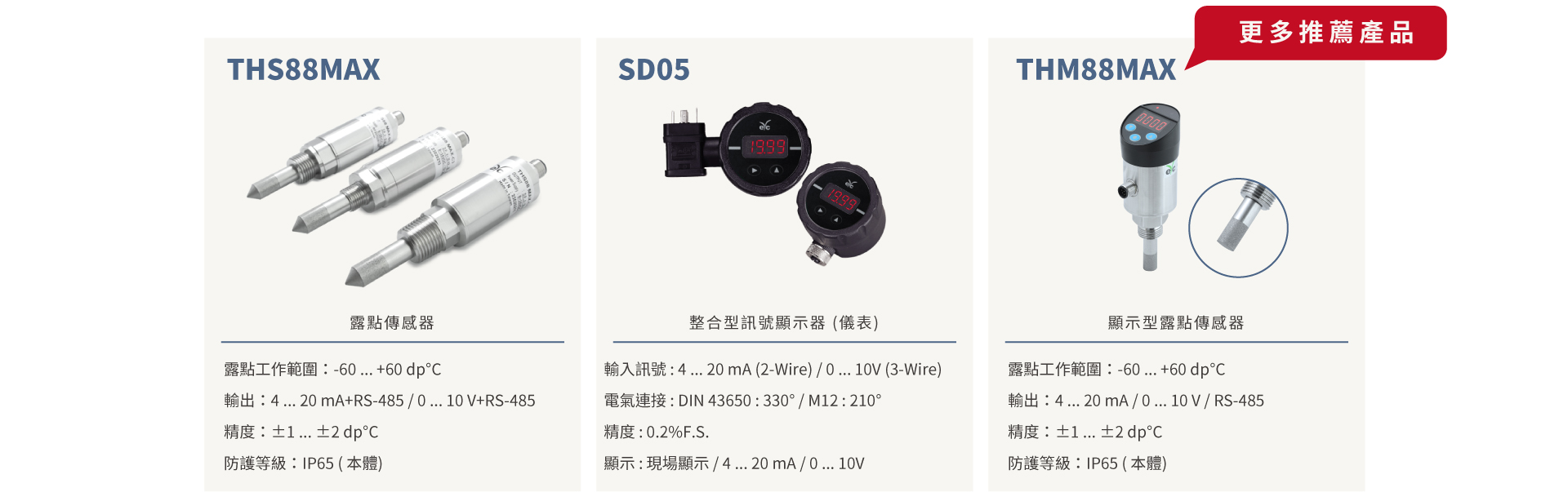 由於本次客戶希望能在量測露點數值之外加上現場顯示監控,我們建議使用eyc-tech THS88MAX 工業級高壓低濕露點傳感器,搭配eyc-tech SD05 整合型訊號顯示器來進行現場露點值的量測監控。
